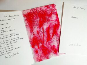 Mordedura, livre pauvre, collection « Morsure » de Daniel Leuwers, 2025. Poème inédit, écrit en portugais : Maria João Cantinho ; intervention peinte : Laurent Grison.